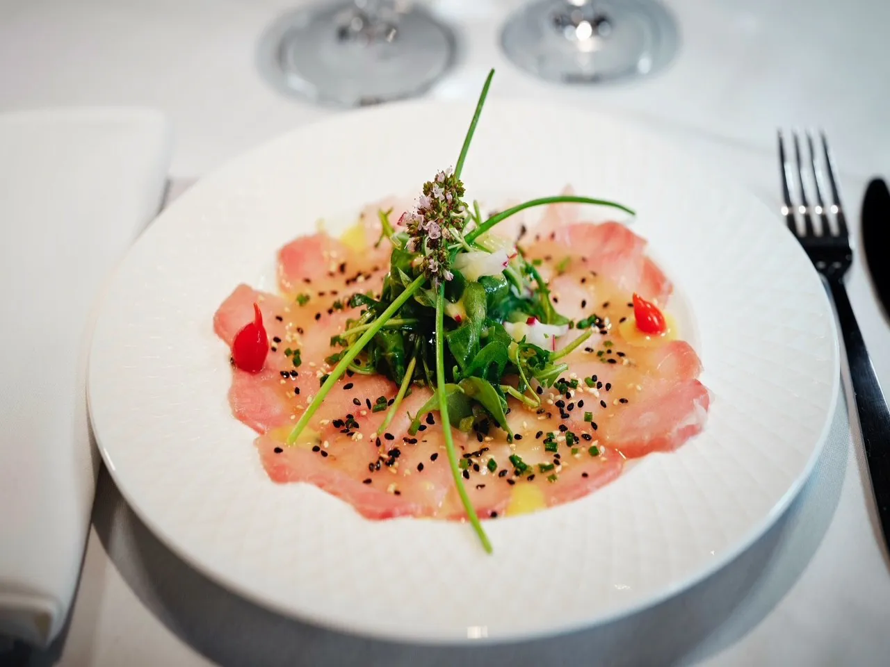 Carpaccio de thon hamachi, sésame, échalotes vertes